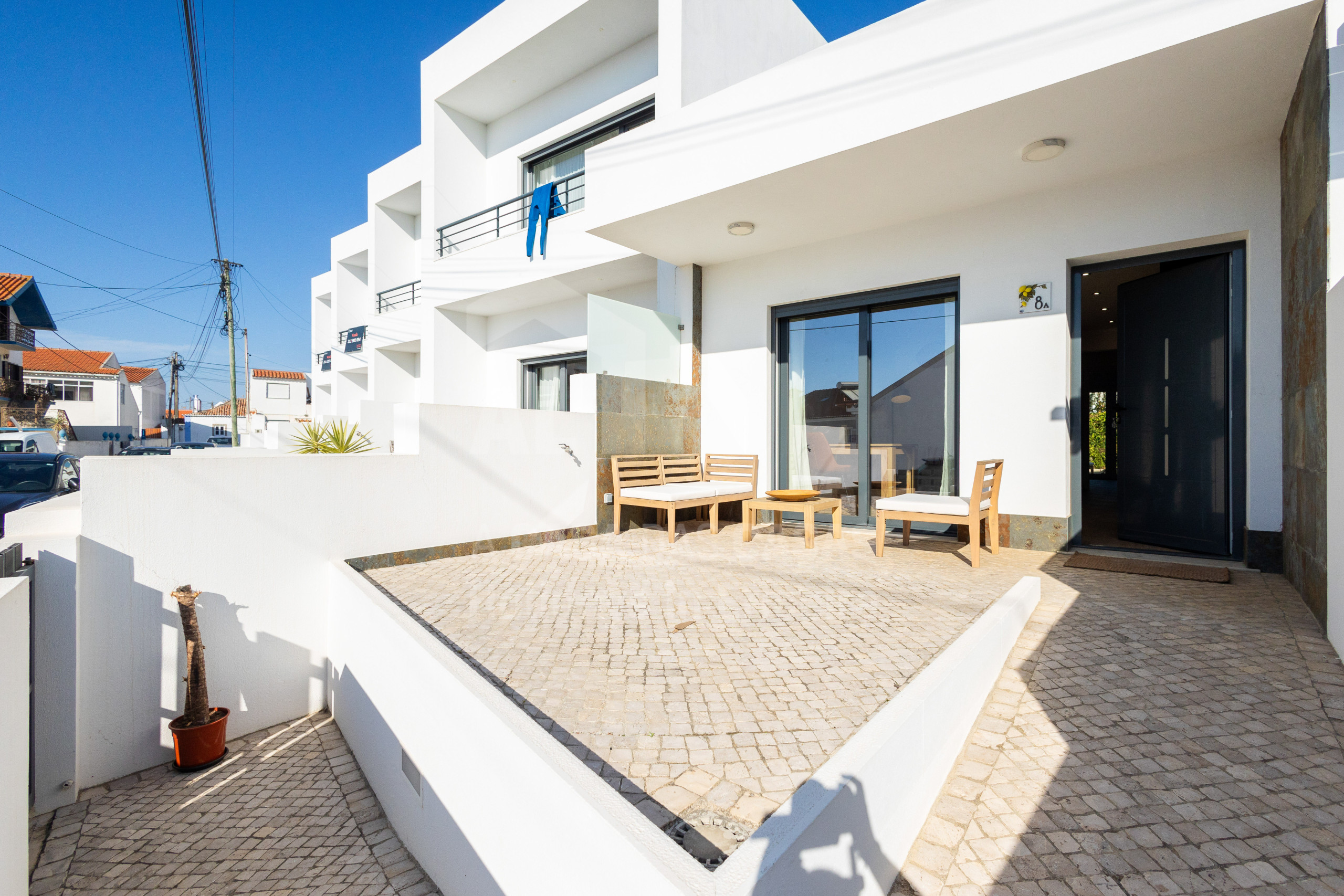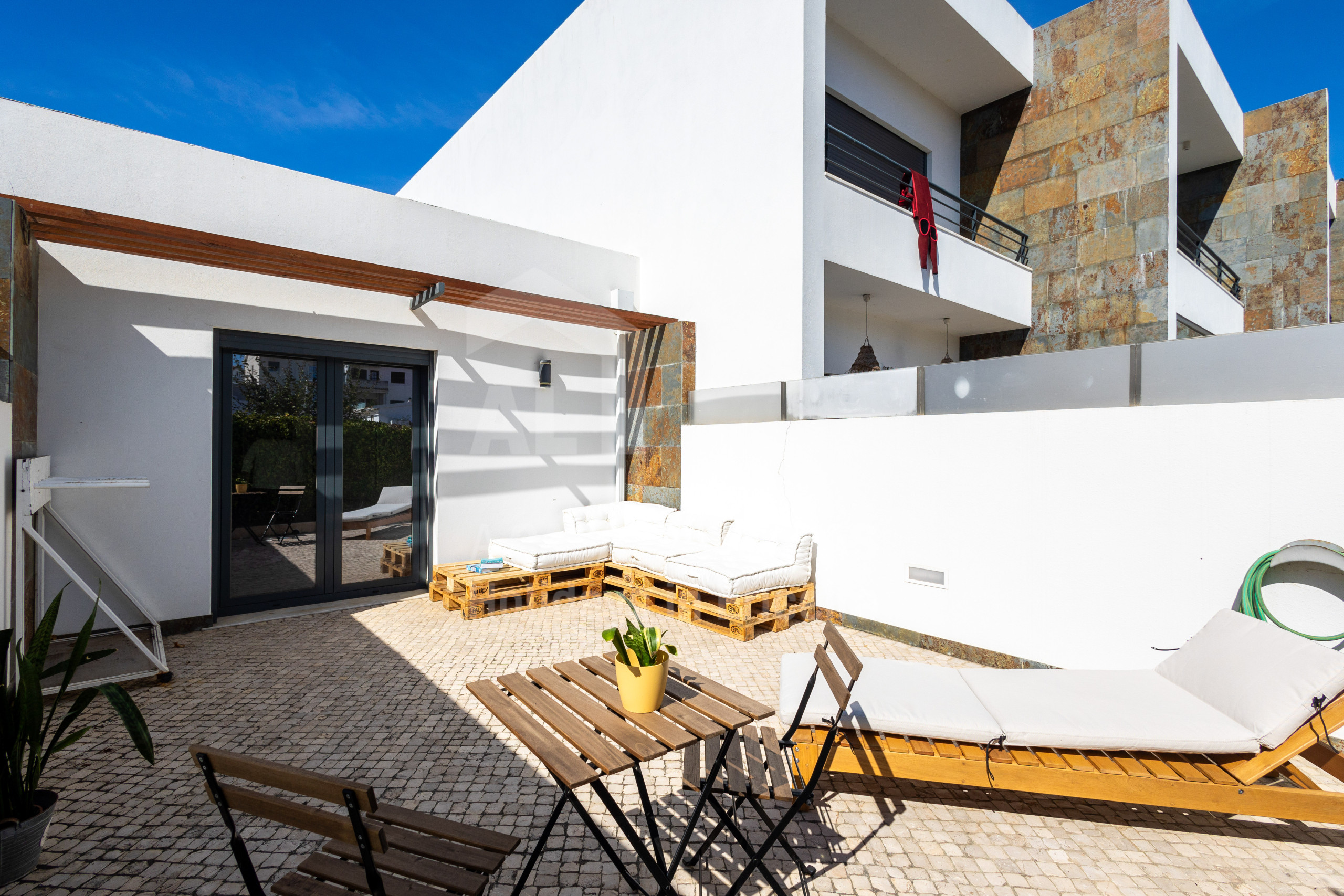 No exterior tem dois agradáveis terraços (um do lado da sala e outro do lado do quarto) equipados com mobiliário de exterior.