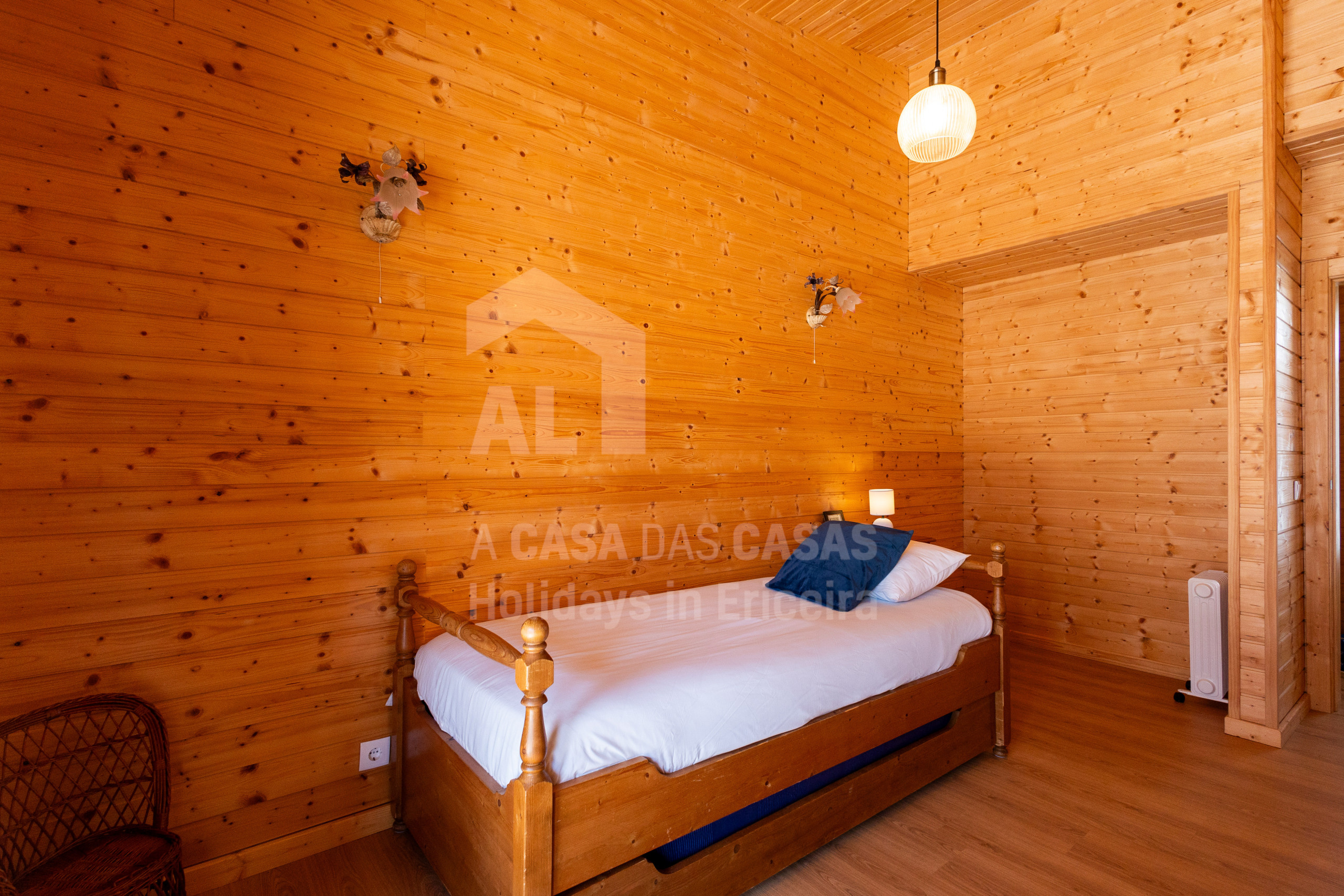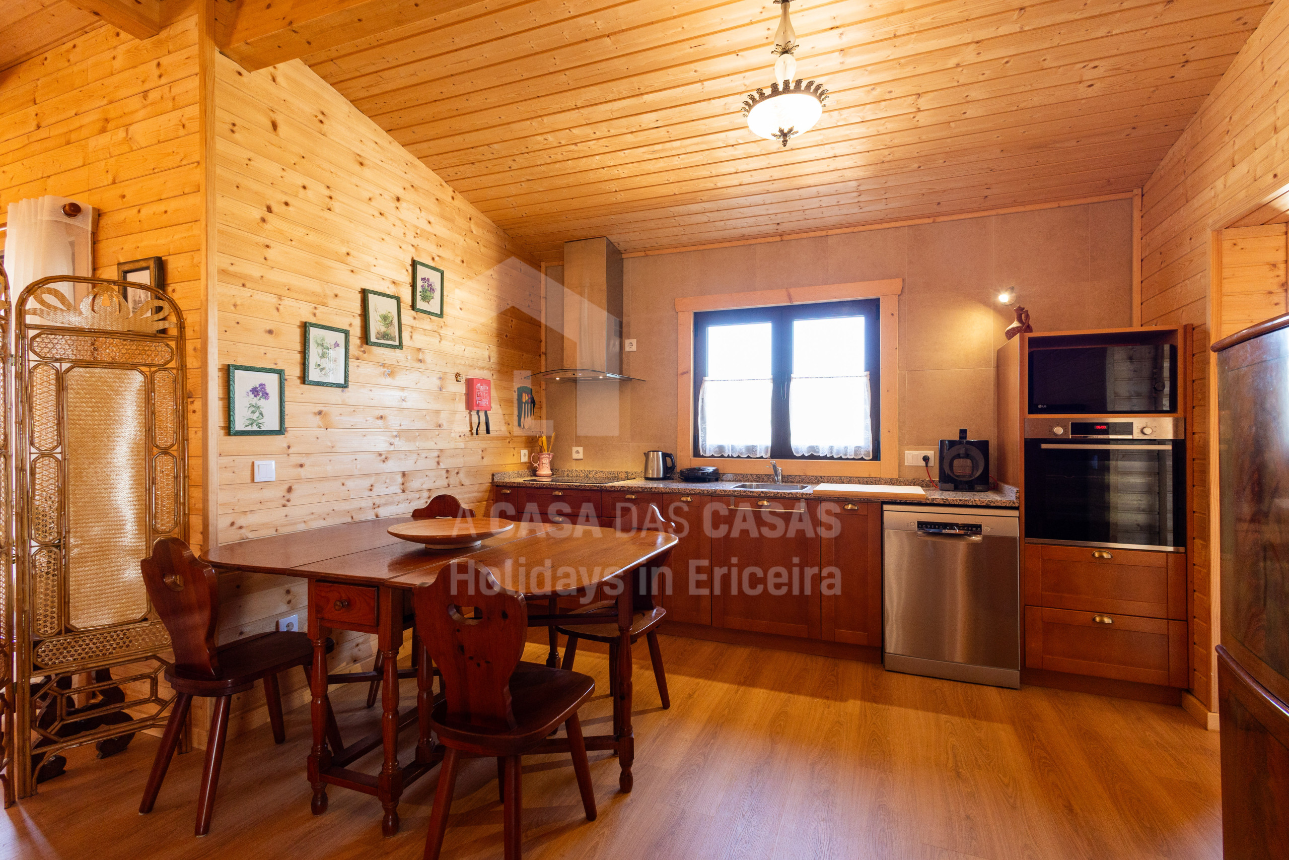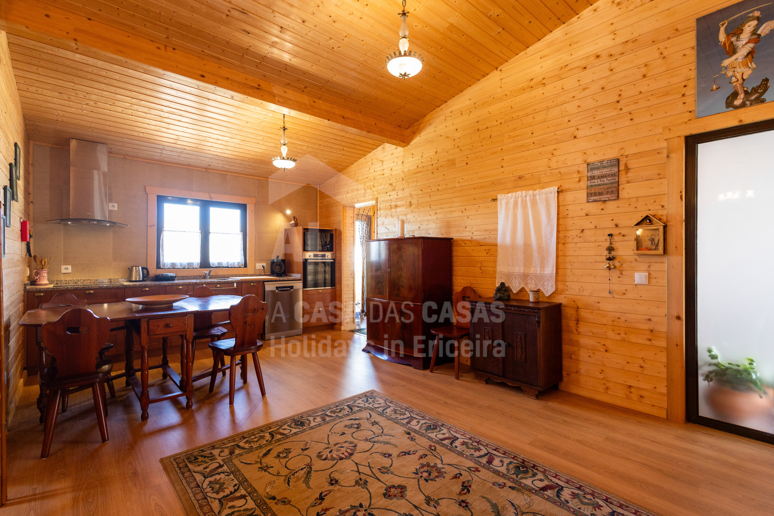 Dispõe de uma sala com sofás, lareira e TV; zona de refeições; cozinha tipo kitchennette totalmente equipada com frigorífico, microondas, forno, congelador, máquina de lavar louça, louças, talheres, utensílios de cozinha, máquina de café, torradeira e jarro eléctrico; um quarto com cama de casal; um quarto com uma cama de gavetão que tem duas camas individuais e uma casa de banho com banheira.