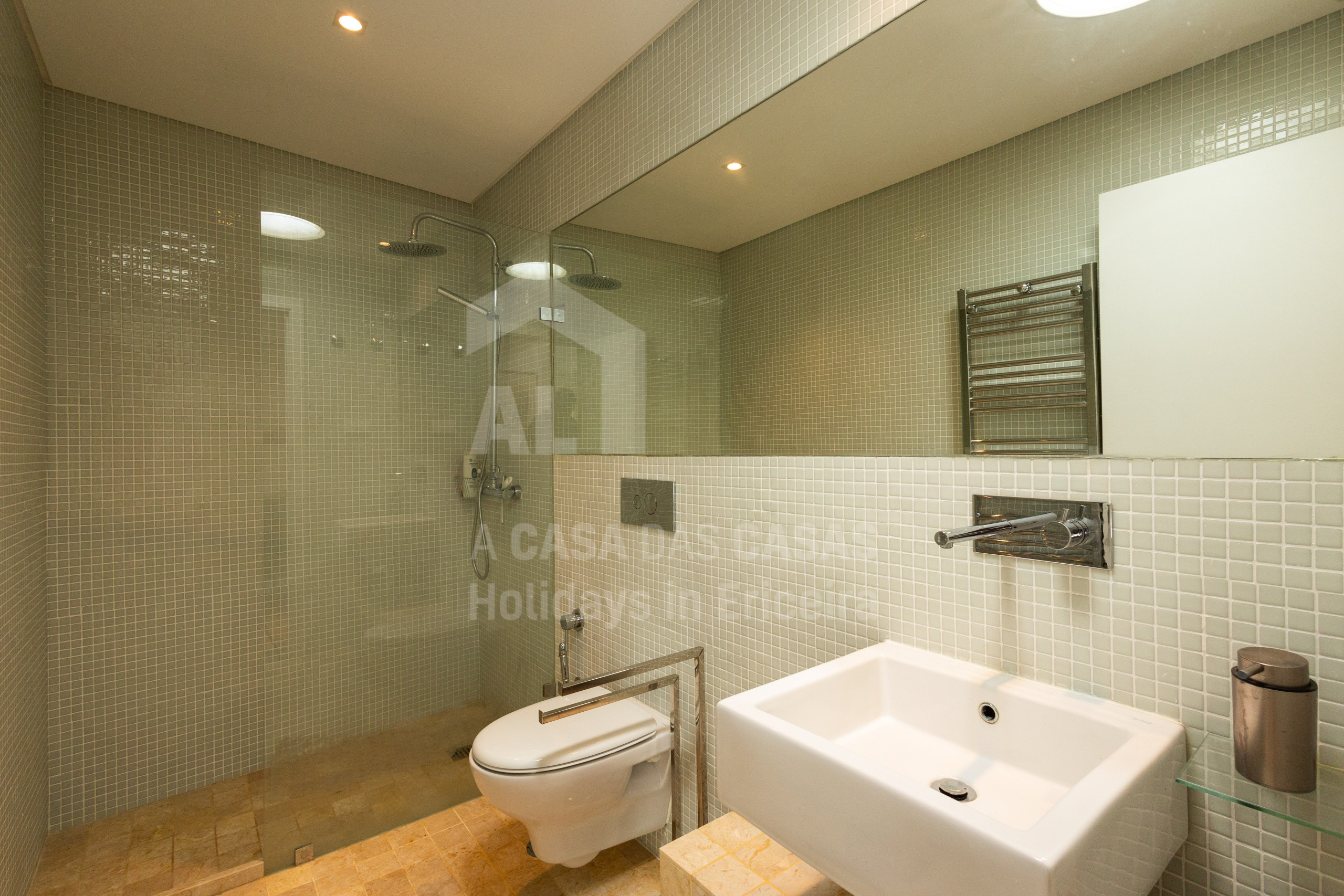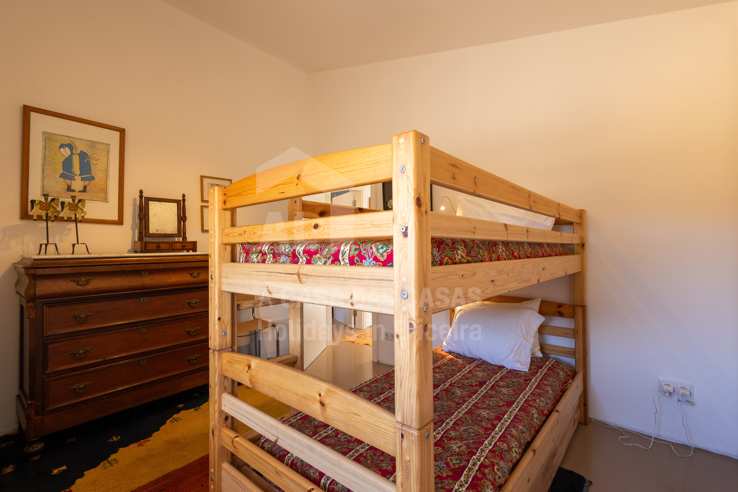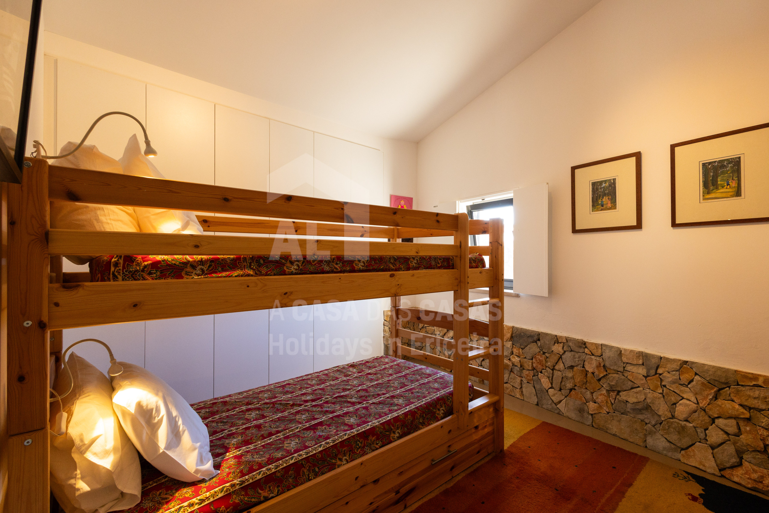 It features a living room with sofas and television, 3 bedrooms with double beds, 1 bedroom with bunk beds (2 beds), 2 bathrooms with shower, a fully equipped kitchen with refrigerator, microwave, oven, freezer, dishwasher, crockery, cutlery, kitchen utensils, coffee machine, toaster and electric kettle and a dining area.